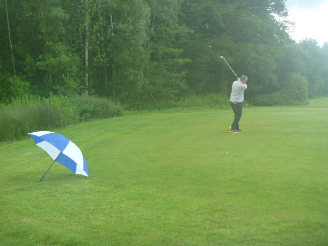 skimming his ball across the lake and then chipping in for a par. Rain