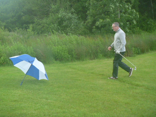 skimming his ball across the lake and then chipping in for a par. Rain